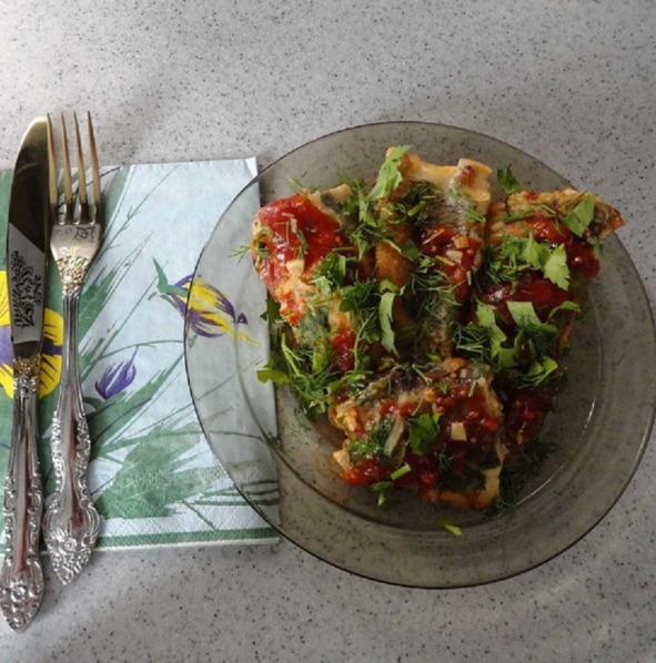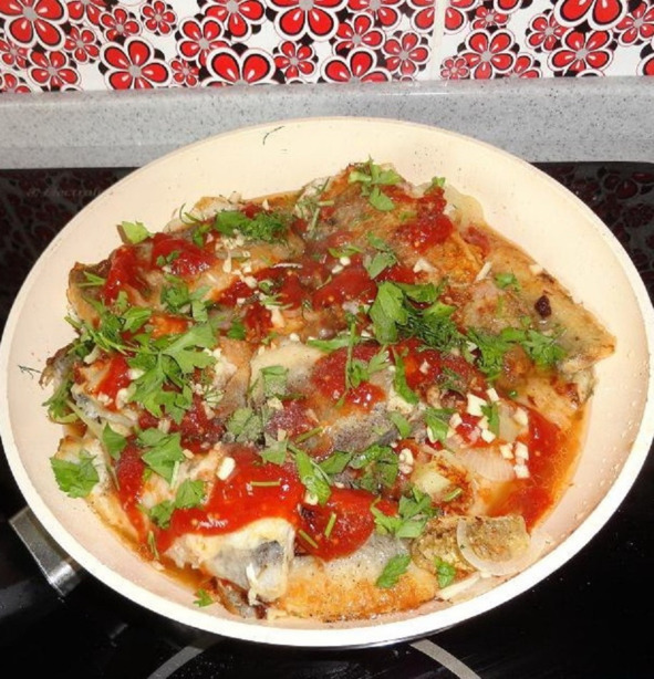 Когда всю рыбу обжарили, возвращаем ее на сковороду, поливаем сверху томатной паст ой (ну или кетчупом) и полстакана воды из чайника. Чеснок добавляем и зеленью посыпаем уже в конце тушения. Накрываем крышкой и тушим. Ну, минут 15—20 вполне хватит – главное, чтобы в сковороде не плавала жидкость.