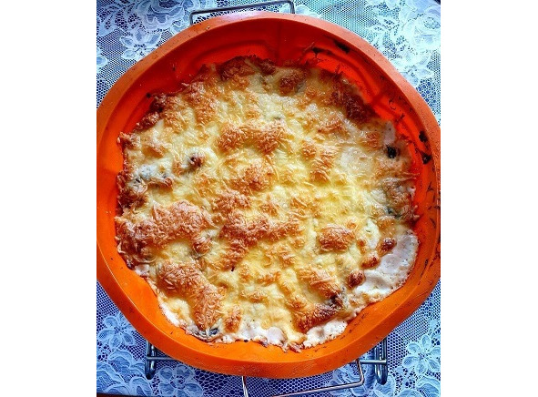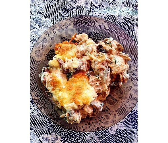Добавим черный молотый перец, мускатный орех, соль по вкусу. Доводим до кипения и убираем с плиты. А теперь смешиваем получившийся соус с грибами и курицей. Раскладываем по жаропрочным формочкам или в одну большую форму и щедро посыпаем натертым сыром. Запекаем в разогретой до 180 градусов духовке минут 20—25 до красивой золотистой корочки.