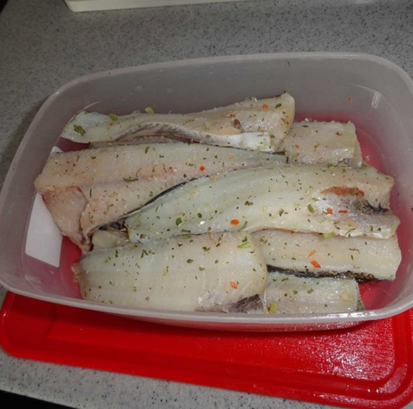 Перед поджаркой рыбу необходимо подсолить. Я для этого использую «Вкусную соль», она со специями. Укладываю ее, слой за слоем, в пластиковый контейнер и пересыпаю солью, пусть постоит с часок.