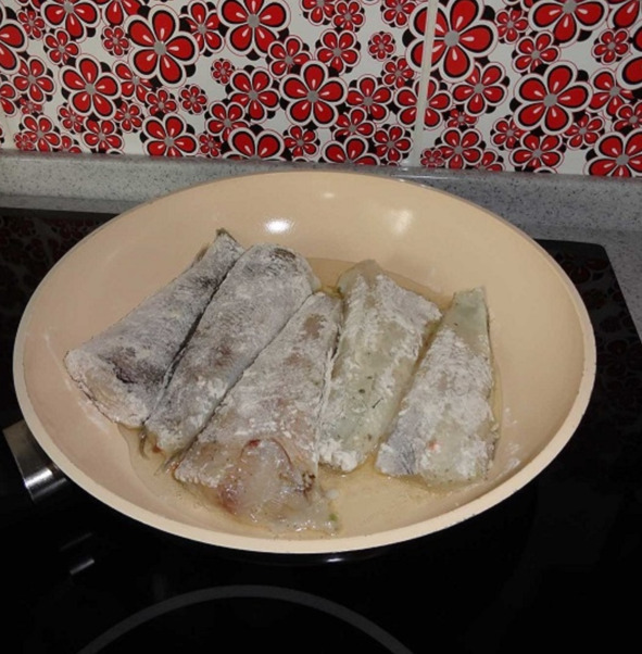 Пошел процесс обжаривания – рыбу обвалял в муке и на сковороду с раскаленным растительным маслом.
