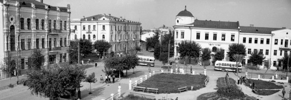 Сквер на углу ул. Советской и ул. им. Коммунаров в г. Гомеле. 23 сентября 1953 г. БГАКФФД – 0—95985 Фото из источника: http://gomel-region.by/ru/photogallery-ru/getRecord/5280241/r_id/528010/