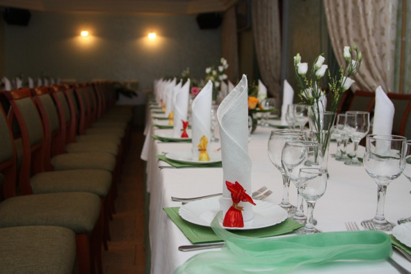 Необходимо, чтобы формление столов радовало глаз. Их принято расставлять в виде букв Т, Ш или П. Столы должны расставляться таким образом, чтобы гости мероприятия могли беспрепятственно передвигаться по залу и чтобы атмосфера отличалась праздничностью и непринужденностью.
