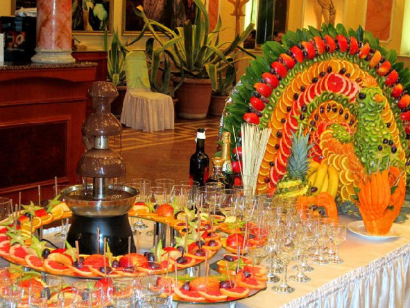 Часто на фуршетах используют блюда с рядом уровней (они особенно подходят для фруктов). Столы украшают флористическими композициями, вазочками с цветами, салфетками, свечками. Блюда с фруктами расставляют в разных местах стола.