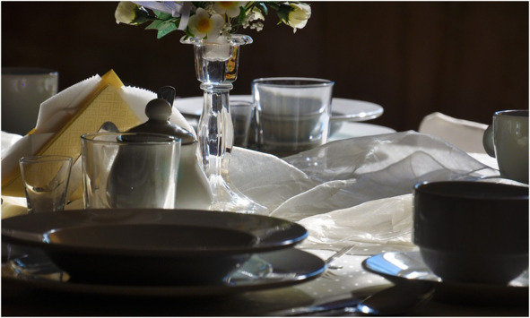 На столе обязательно присутствие цветочной композиции, устанавливаемой или посередине стола, или недалеко от его края.