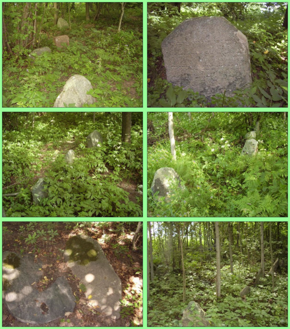 Около 10% камней лежат надписью ниц, причем большинство из них – именно на этом валу, чему способствовали их размеры и откос. Вероятно, такой же процент камней ушел под землю, а так как кладбище покрыто лиственным лесом с большим количество корней, перевернуть/извлечь их весьма проблематично.