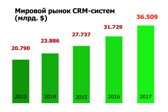 Общий рынок CRM в 2015 году вырос на 12,3 процента. Четыре крупнейших поставщика с предложениями CRM-систем – Salesforce, SAP, Oracle и Microsoft, в 2015 году на их долю приходилось 42 процента рынка. Другие поставщики также популярны у предприятий малого и среднего бизнеса.