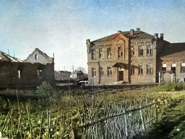 Старое фото Чаус. Школа. Фото сделано оккупантами во время войны. Источник: https://chausy.by/foto/foto-starye-chausy/foto-gorelova