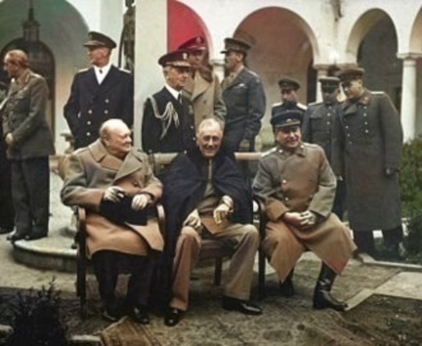 Уинстон Черчилль (премьер-министр Соединенного Королевства), Франклин Д. Рузвельт (президент Соединенных Штатов) и Иосиф Сталин (Генеральный секретарь Советского Союза) на Ялтинской конференции, 1945 год.