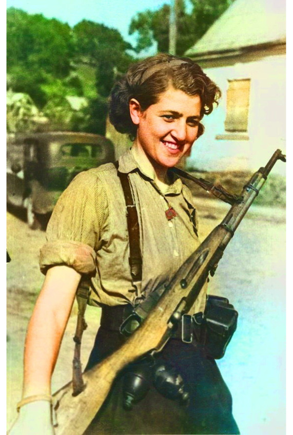 Сара Гинайте-Рубинсон, женщина-партизанка отряда «Смерть оккупантам». При освобождении Вильнюса, Литва (13 июля 1944 г.). Фотография была сделана майором Красной армии. Она была черно-белой. Я ее покрасила. Источник: https://www.pinterest.com.au/pin/289004501072714031/