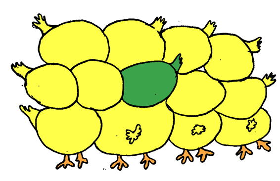 Среди сплошной желтой массы новорожденных цыплят прохаживался зеленый пучок травы, который на самом деле пучком травы вовсе не был.