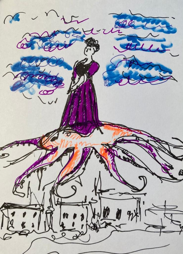 «Почему же так долго ничего не происходит? – подумала Марта, – пора начинать по-настоящему фантазировать». И она закрыла глаза, а когда открыла их, слегка остолбенела. С неба спустился большой разноцветный осьминог, на его спине сидела чернокожая женщина и ослепительно улыбалась. «Может быть, это и слишком, но я просто захотела полетать. У этого мира, оказывается, прекрасное чувство юмора,» – подумала Марта.