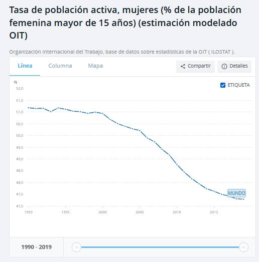 este período la tasa de población mundial activa de mujeres mayores de 15 años ha disminuido considerablemente. Se observa que cada vez trabajan menos mujeres, pues la principal razón es que les cuesta más conciliar vida familiar y laboral.