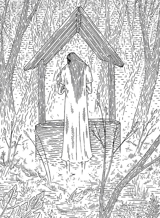 Я тебе, моя малютка,колыбельную спою,Спи, малыш мой, сладко-сладко,Баю-баюшки-баю[1]Босая молодая женщина в белой ночной рубашке по щиколотки стояла к нам спиной и смотрела в колодец. Из-за тумана казалось, что она парит над землей. Длинные каштановые волосы струились по ее спине.