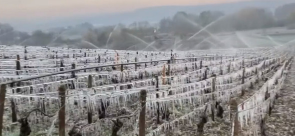 На виноградник вечером распыляется вода, для того, чтобы почки покрылись сосульками