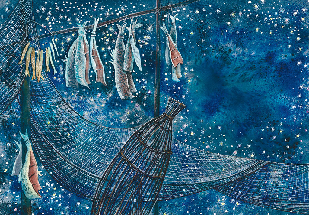 Оттолкнувшись от краешка остроносой горы, охотник подпрыгнул так высоко, что смог зацепиться руками за одну из звёзд и вскарабкаться на небо. Хвостатые кометы тут же разлетелись по всему небосводу, оповещая его обитателей о появлении чужака: