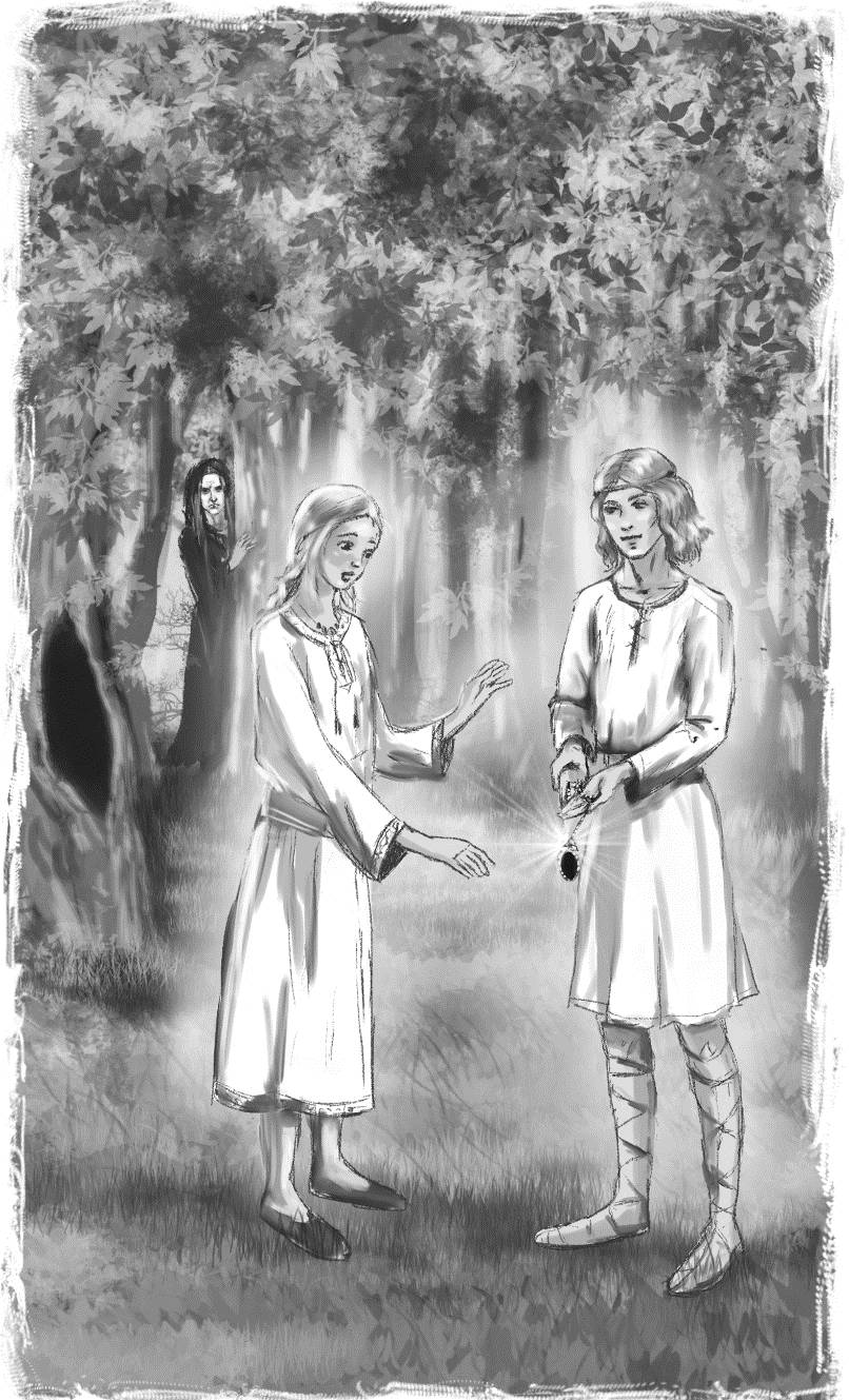Девочка бережно сняла ожерелье и передала его спутнику. Тот завернул находку в тряпку и засунул за пазуху. После чего, взявшись за руки, ребята, которым молчаливый лес казался уже не таким страшным, весело зашагали в обратную сторону, совершенно не подозревая, что вслед им вышедшая из-за дуба белая фигура с надвинутым на лицо капюшоном устремила злобный взгляд, полный ненависти.