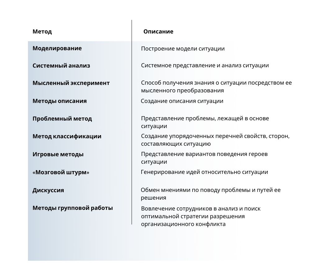 Для анализа организационных конфликтов нам понадобится набор и понимание методов, которые могут в этом помочь.