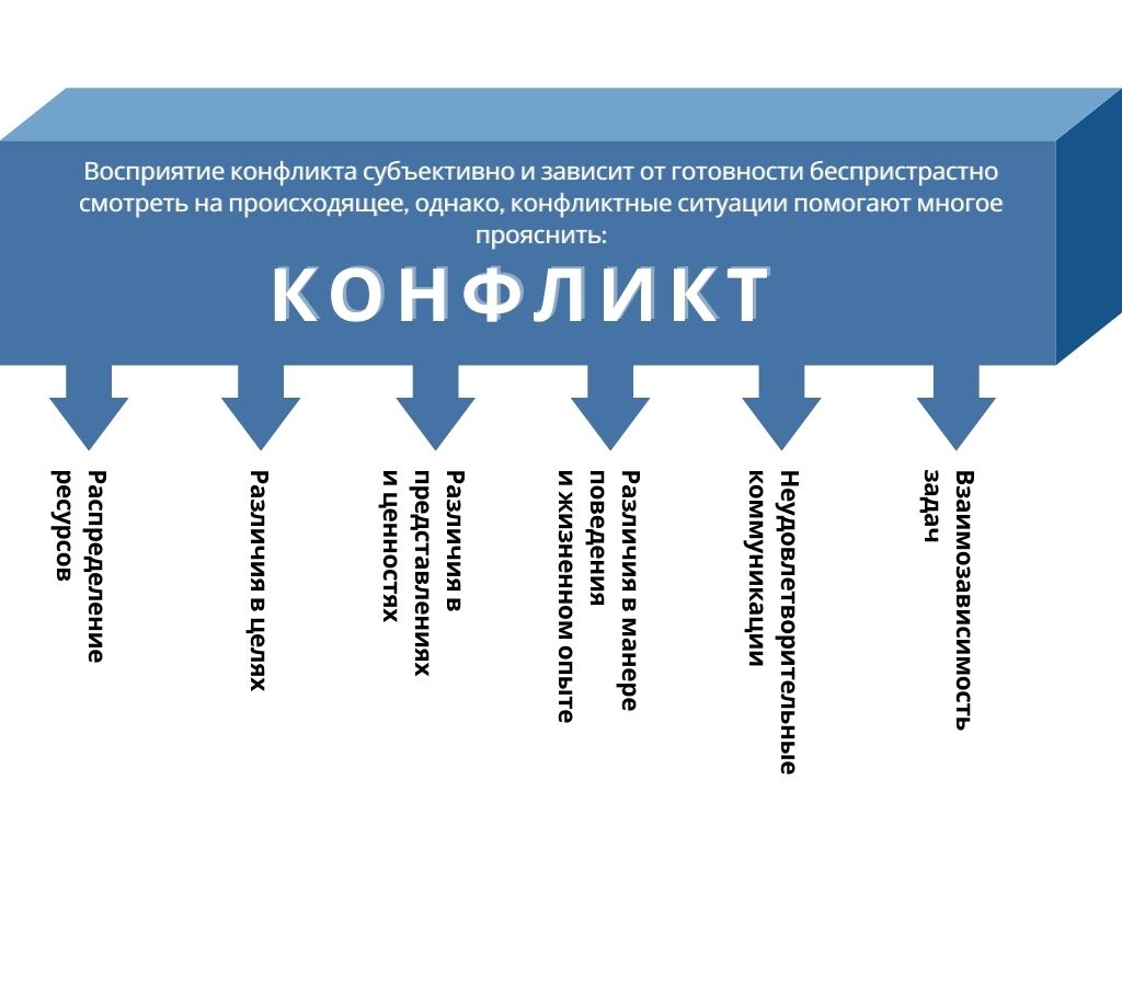 В коллективе происходит конфликт, когда одна из сторон полагает, что намерения или действия противоположной стороны угрожают ей, дискриминируют, принижают ее значимость, создают неравное положение, затрудняют доступ к ресурсам или что-то еще.
