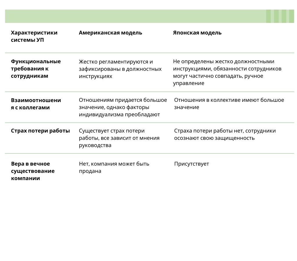 Как видно из таблицы, американская модель управления организацией приспосабливается к внешним обстоятельствам, изменение которых изменяет деятельность организации в целом. В японской модели управления важнейшие механизмы изменений связаны с внутренними механизмами размещения рабочей силы.
