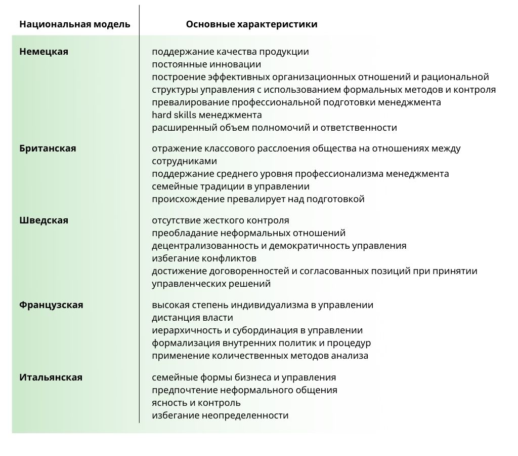 Европейская модель в целом представляет собирательный образ менеджмента стран Европы. Для примера я проанализировала их в таблице, приведенной ниже.