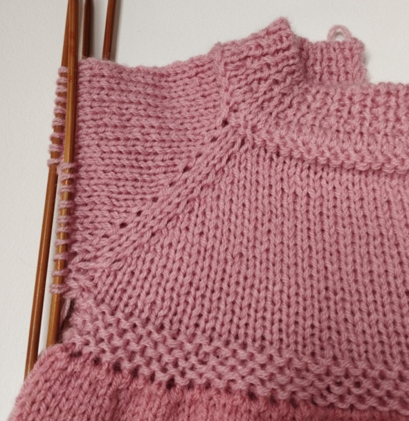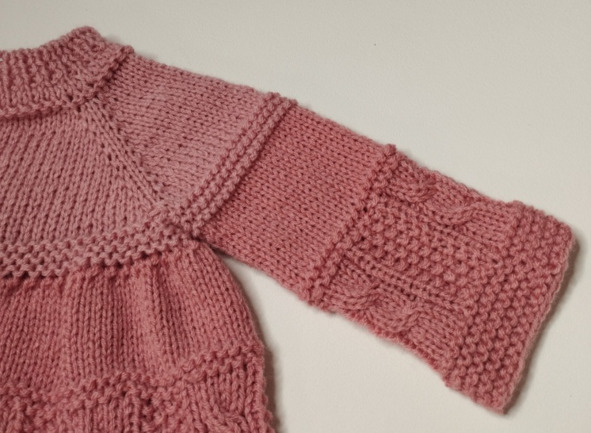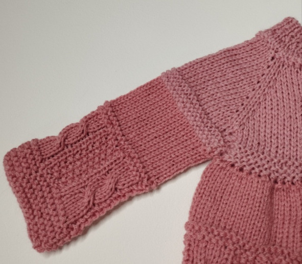 1 ряд: набираем 2 петли по краю переда, далее вяжем 30 лицевых рукава, затем набираем 6 петель по краю спинки (всего 38 петель – 2+30+6 = 38)