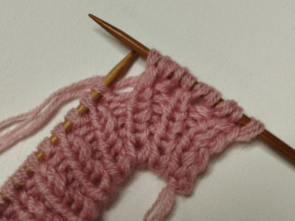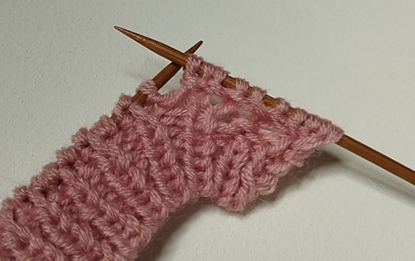 39 ряд: (1 изнаночная, 2 петли снять на запасную спицу, 2 лицевых, 2 лицевых с запасной спицы, 1 изнаночная, 1 лицевая, (1 лицевая, 1 изнаночная) – повторить 2 раза, 1 лицевая) – повторить 3 раза