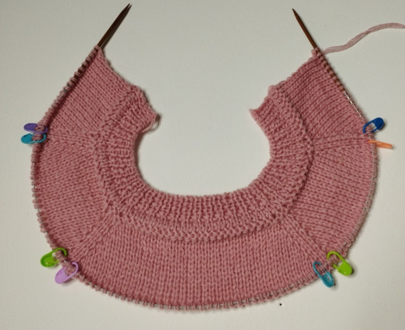 15 ряд: кромочная, 17 лицевых, прибавка из протяжки, 2 лицевых, прибавка из протяжки, 22 лицевых, прибавка из протяжки, 2 лицевых, прибавка из протяжки, 38 лицевых, прибавка из протяжки, 2 лицевых, прибавка из протяжки, 22 лицевых, прибавка из протяжки, 2 лицевых, прибавка из протяжки, 17 лицевых, 1 изнаночная