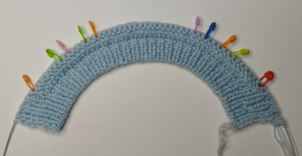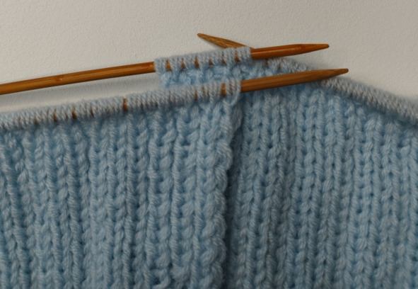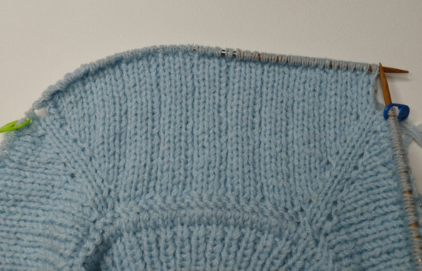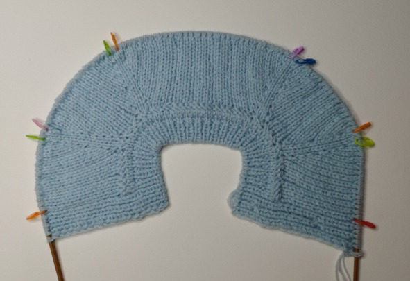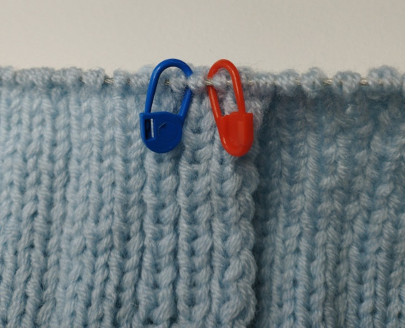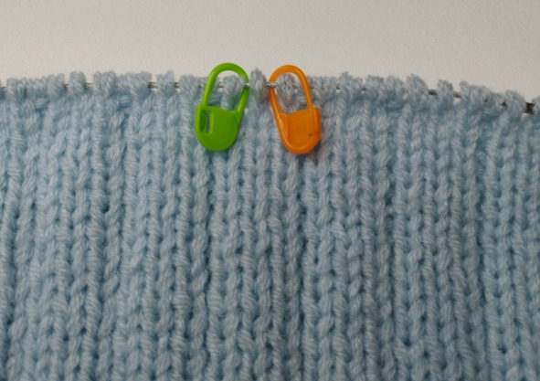 Затем будем вязать ластовицу. Для этого по центру переда и спинки нужно повесить маркеры, одна петля между маркерами.