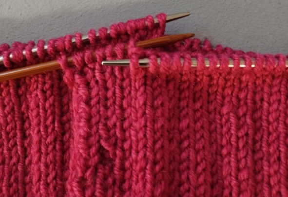 72 ряд (после синего маркера): 2 лицевых, 1 изнаночная, (3 лицевых, 1 изнаночная) – повторить 10 раз, 1 лицевая, прибавка из протяжки, 3 лицевых, прибавка из протяжки, 1 лицевая, (1 изнаночная, 3 лицевых) – повторить 10 раз, 1 изнаночная, 2 лицевых, прибавка из протяжки, 3 лицевых, прибавка из протяжки