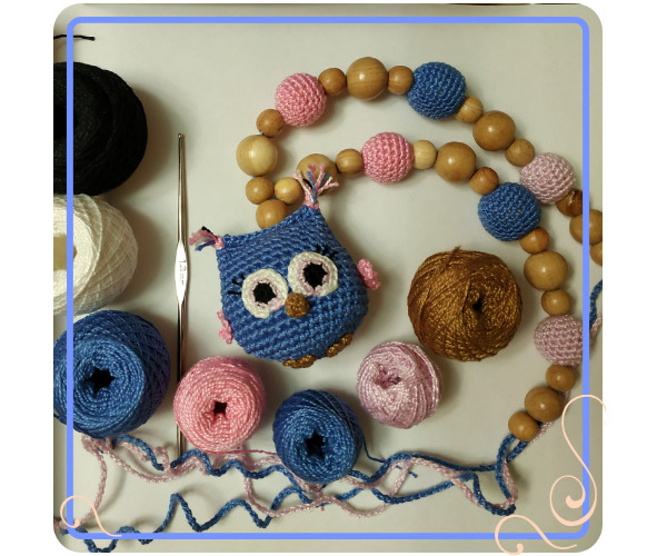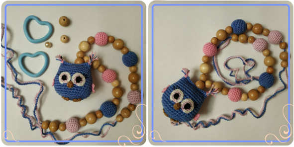 • синий (или на ваш выбор) – тело совушки, бусины. Совушку связана в две нити;