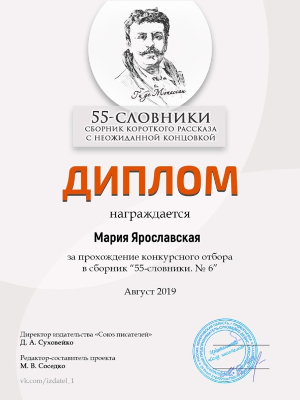 Так же внезапно для себя поучаствовала в конкурсе рассказов 55 слов, о Российского Союза Писателей, получила диплом и возможность опубликоваться в сборнике, формат небольшой, обложка плотная, приятная компания знакомых и полюбившихся авторов.