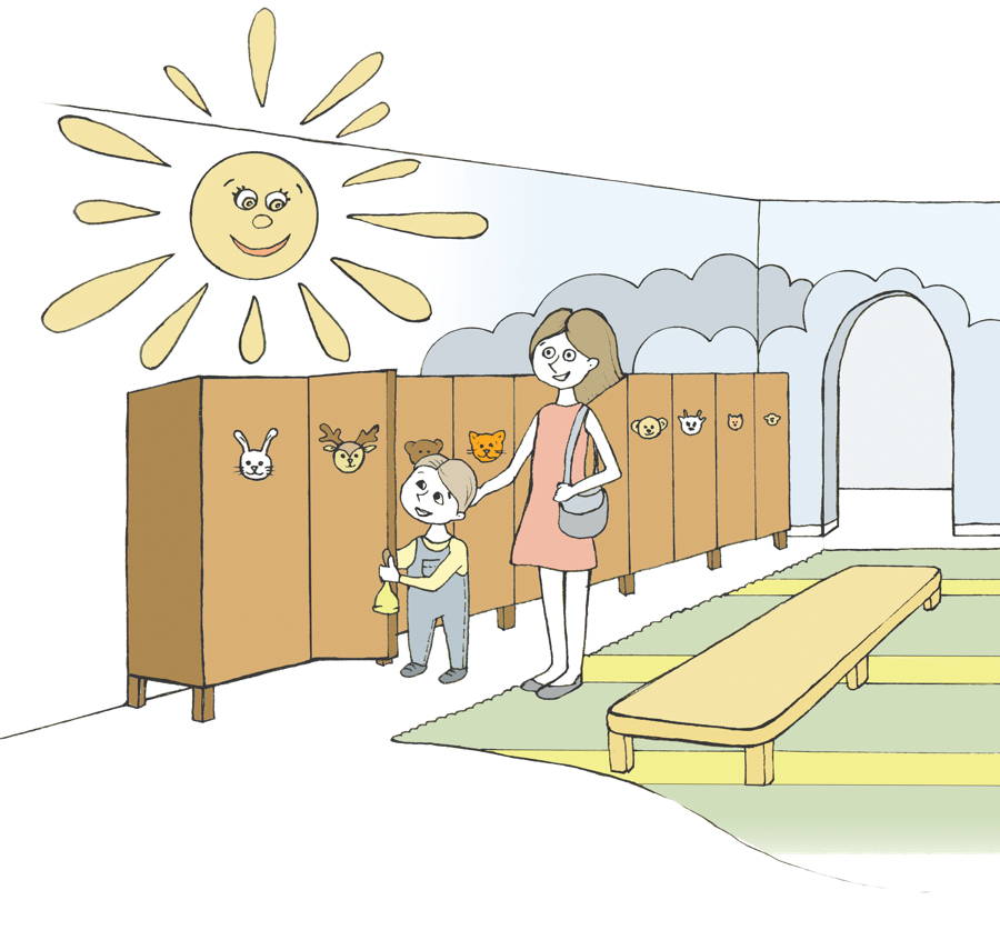 Она берет Сашу за ручку и ведет к шкафчику с картинкой оленёнка.