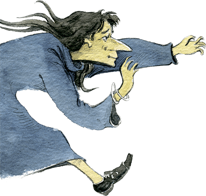И вправду! Следом за ними с развевающимися на бегу волосами неслась Филомена. Только сейчас Каролинка заметила, какой у неё длинный острый нос, похожий на клюв аиста. Колдунья протягивала к Каролинке руки с цепкими когтистыми пальцами и что-то кричала. Но что – непонятно: в универмаге, как всегда, было шумно, и отдельный голос терялся в общем гомоне. К счастью, такси уже летело над крышами, и колдунья осталась с носом. Каролинке ужасно хотелось поподробнее расспросить водителя про эту Филомену и голубую бусинку, но ей помешала тётя Агата. Она не могла налюбоваться своей шляпкой с фиалками, смотрелась в зеркальце и требовала, чтобы Каролинка с таксистом восхищались, какая шляпка элегантная и какие на ней чудесные цветочки.