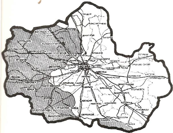 (Карта Московской области. Заштрихованы районы, которые были временно оккупированы немецко-фашистскими захватчиками)