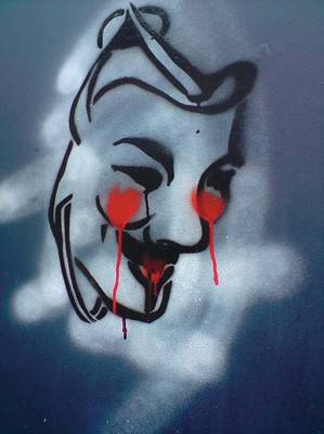 "V for Vendetta mask stencil crying" by OperationPaperStorm is licensed under CC BY 2.0.