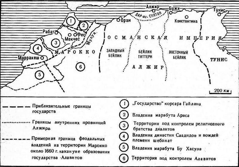 Дальнейшие междоусобицы привели к распаду государств-империй Магриба, к преобладанию мелких «удельных княжеств», древние столицы которых пришли в упадок в затяжной период испано-османских войн за обладание Средиземным морем. Так, в Среднем Магрибе, территория которого приблизительно соответствовала основной части современного Алжира, каждая такая столица в XIV–XV веках насчитывала 80-100 тыс. жителей: Тлемсен, Константина, Бужи (ныне Беджайя)[20]. Этот город был основан в XI веке на склоне горы, спускавшейся к прекрасной бухте, как столица эмирата Хаммадидов[21]. Знаменитый географ XII века аль-Идриси утверждал, что в этом кипящем деловой активностью городе проживало не менее 100 тыс. человек и что к нему тянулись караваны, а в гавани бросали якорь многочисленные корабли. «Бужи, – писал он, – это склад товаров. Жители богаты, умелы в разных искусствах и ремеслах больше, чем кто бы то ни было; и поэтому торговля здесь процветает. Купцы этого города связаны с торговцами Сахары, Запада и Востока»[22]. Тот же автор сообщил, что горожане занимались в окрестных горах Кабилии разработкой двух месторождений железной руды, добывали медь и свинец. В XV веке Бужи еще имел сравнительно большой флот, неоднократно приходивший на помощь эмирату Гранада, и насчитывал 24 тыс. домашних очагов. Но за время почти 50-летней испанской оккупации город сильно пострадал.
