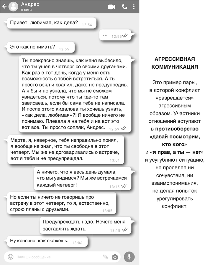 О коммуникации я уже писала в книге «Полюби свой пол», где представлено множество средств, техник и пошаговых инструкций для практики ассертивного поведения. Если ты ее не читал, знай, что существует три типа коммуникации: пассивная, агрессивная и ассертивная. Для разрешения конфликтных ситуаций рекомендуется придерживаться ассертивного поведения. Приведем наглядный пример для каждого типа коммуникации, чтобы получить представление о том, чем закончится спор в каждом конкретном случае.
