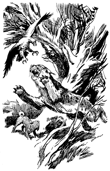 Орлица сложила крылья и ринулась в атаку. Перед самой землею она выбросила крылья, с ходу долбанула щенка острым клювом. Затем когти легко, как в мягкую глину, погрузились в бока щенка. Еще через мгновение огромная птица с добычей летела над тайгою.