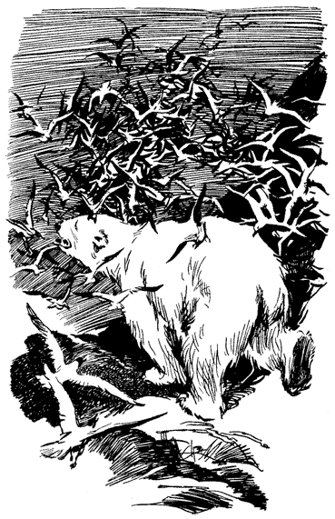 Ба! Да это же песец! Летом бесследно исчезает его роскошная голубовато-белая шубка, и он здорово смахивает на бродячую облезлую кошку. Песца вовремя заметила сова. Моргнула сердитыми янтарными глазами, неслышно снялась с кочки. С высоты она камнем упала на неудачливого охотника, вонзив в тощие жесткие бока когти-иглы, поднялась с ним в воздух. Затем выпустила живую ношу – бедняга хлопнулся на камни, взвыл от боли и с тявканьем, хромая сразу на обе передние ноги, заковылял в глубь острова. Гуси громко загоготали, благодаря защитницу сову.