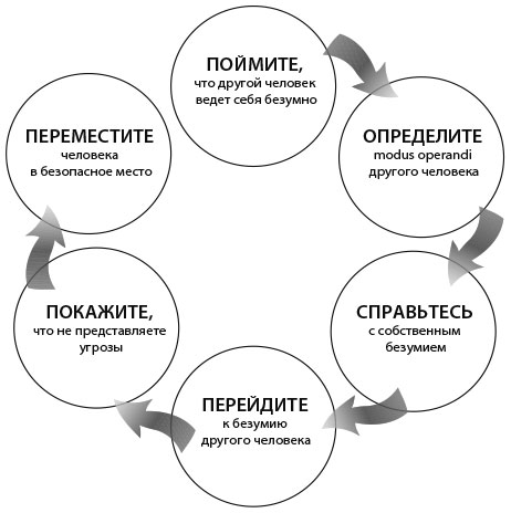 Цикл благоразумия вместо политики «бей или беги»Учтите, что вам придется сознательно вживаться в роль психа, потому что ваш организм не захочет, чтобы вы вели себя подобным образом. Когда вы общаетесь с иррациональным человеком, тело посылает вам сигналы, предупреждая об опасности. Как-нибудь обратите на это внимание и убедитесь сами: горло сжимается, пульс ускоряется, у вас начинает болеть живот или голова. Для такой физиологической реакции иногда достаточно просто назвать имя неприятного знакомого.