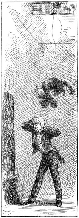 Now the master, mellow almost to the verge of geniality, put his chair aside, turned his back to the audience, and began to draw a map of America on the blackboard, to exercise the geography class upon. But he made a sad business of it with his unsteady hand, and a smothered titter rippled over the house. He knew what the matter was, and set himself to right it. He sponged out lines and remade them; but he only distorted them more than ever, and the tittering was more pronounced. He threw his entire attention upon his work, now, as if determined not to be put down by the mirth. He felt that all eyes were fastened upon him; he imagined he was succeeding, and yet the tittering continued; it even manifestly increased. And well it might. There was a garret above, pierced with a scuttle over his head; and down through this scuttle came a cat, suspended around the haunches by a string; she had a rag tied about her head and jaws to keep her from mewing; as she slowly descended she curved upward and clawed at the string, she swung downward and clawed at the intangible air. The tittering rose higher and higher – the cat was within six inches of the absorbed teacher’s head – down, down, a little lower, and she grabbed his wig with her desperate claws, clung to it, and was snatched up into the garret in an instant with her trophy still in her possession! And how the light did blaze abroad from the master’s bald pate – for the sign-painter’s boy had gilded it!