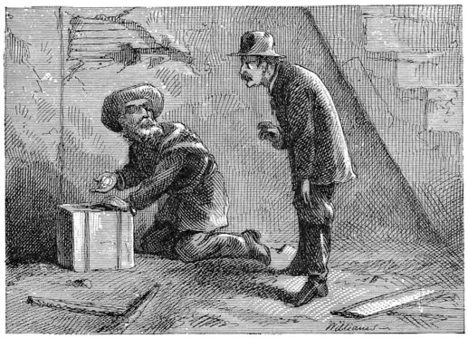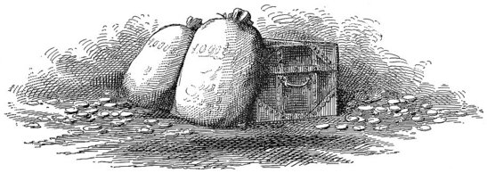 “Good idea,” said the comrade, who walked across the room, knelt down, raised one of the rearward hearth-stones and took out a bag that jingled pleasantly. He subtracted from it twenty or thirty dollars for himself and as much for Injun Joe, and passed the bag to the latter, who was on his knees in the corner, now, digging with his bowie-knife.