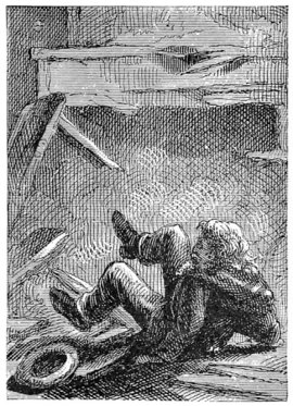 The boys’ breath forsook them. Injun Joe put his hand on his knife, halted a moment, undecided, and then turned toward the stairway. The boys thought of the closet, but their strength was gone. The steps came creaking up the stairs – the intolerable distress of the situation woke the stricken resolution of the lads – they were about to spring for the closet, when there was a crash of rotten timbers and Injun Joe landed on the ground amid the débris of the ruined stairway. He gathered himself up cursing, and his comrade said: