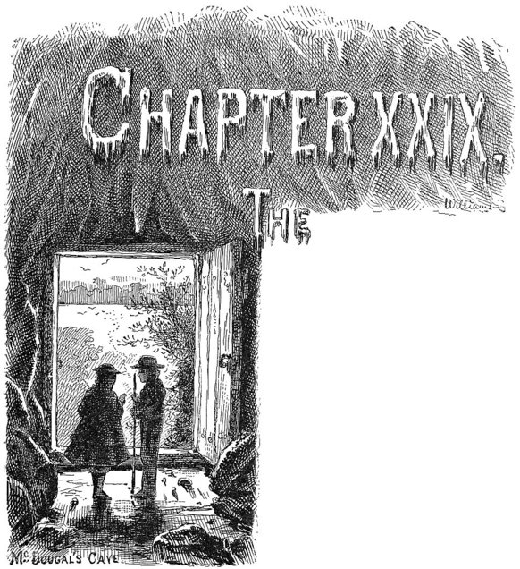 Tom and Huck rose up, weak but vastly relieved, and stared after them through the chinks between the logs of the house. Follow? Not they. They were content to reach ground again without broken necks, and take the townward track over the hill. They did not talk much. They were too much absorbed in hating themselves – hating the ill luck that made them take the spade and the pick there. But for that, Injun Joe never would have suspected. He would have hidden the silver with the gold to wait there till his “revenge” was satisfied, and then he would have had the misfortune to find that money turn up missing. Bitter, bitter luck that the tools were ever brought there!