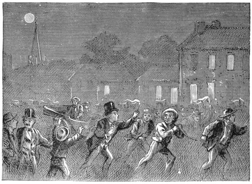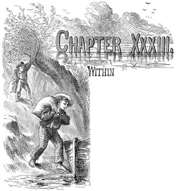 He disappeared, and presently returned with the wagon, put the two small sacks into it, threw some old rags on top of them, and started off, dragging his cargo behind him. When the boys reached the Welshman’s house, they stopped to rest. Just as they were about to move on, the Welshman stepped out and said: