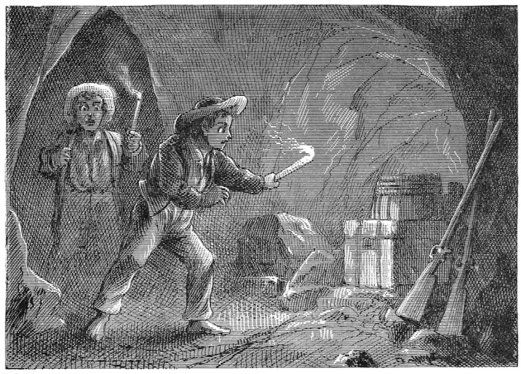It was the treasure-box, sure enough, occupying a snug little cavern, along with an empty powder-keg, a couple of guns in leather cases, two or three pairs of old moccasins, a leather belt, and some other rubbish well soaked with the water-drip.