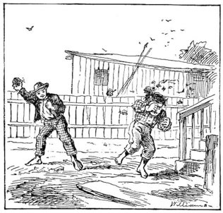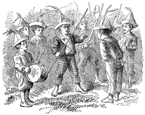 Tom skirted the block, and came round into a muddy alley that led by the back of his aunt’s cow-stable. He presently got safely beyond the reach of capture and punishment, and hastened toward the public square of the village, where two “military” companies of boys had met for conflict, according to previous appointment. Tom was General of one of these armies, Joe Harper (a bosom friend) General of the other. These two great commanders did not condescend to fight in person – that being better suited to the still smaller fry – but sat together on an eminence and conducted the field operations by orders delivered through aides-de-camp. Tom’s army won a great victory, after a long and hard-fought battle. Then the dead were counted, prisoners exchanged, the terms of the next disagreement agreed upon, and the day for the necessary battle appointed; after which the armies fell into line and marched away, and Tom turned homeward alone.