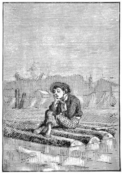 He wandered far from the accustomed haunts of boys, and sought desolate places that were in harmony with his spirit. A log raft in the river invited him, and he seated himself on its outer edge and contemplated the dreary vastness of the stream, wishing, the while, that he could only be drowned, all at once and unconsciously, without undergoing the uncomfortable routine devised by nature. Then he thought of his flower. He got it out, rumpled and wilted, and it mightily increased his dismal felicity. He wondered if she would pity him if she knew? Would she cry, and wish that she had a right to put her arms around his neck and comfort him? Or would she turn coldly away like all the hollow world? This picture brought such an agony of pleasurable suffering that he worked it over and over again in his mind and set it up in new and varied lights, till he wore it threadbare. At last he rose up sighing and departed in the darkness.