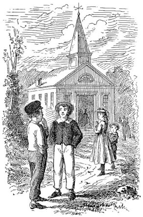 Sabbath-school hours were from nine to half-past ten; and then church service. Two of the children always remained for the sermon voluntarily, and the other always remained too – for stronger reasons. The church’s high-backed, uncushioned pews would seat about three hundred persons; the edifice was but a small, plain affair, with a sort of pine board tree-box on top of it for a steeple. At the door Tom dropped back a step and accosted a Sunday-dressed comrade: