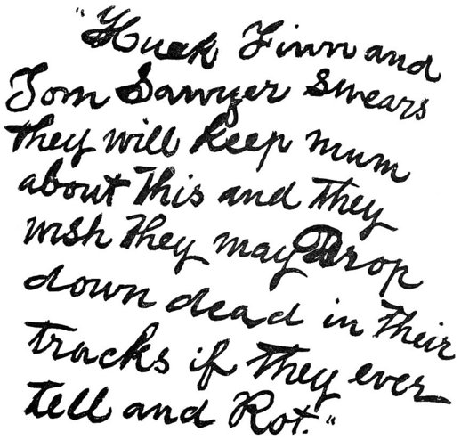 Tom’s whole being applauded this idea. It was deep, and dark, and awful; the hour, the circumstances, the surroundings, were in keeping with it. He picked up a clean pine shingle that lay in the moonlight, took a little fragment of “red keel” out of his pocket, got the moon on his work, and painfully scrawled these lines, emphasizing each slow down-stroke by clamping his tongue between his teeth, and letting up the pressure on the up-strokes:
